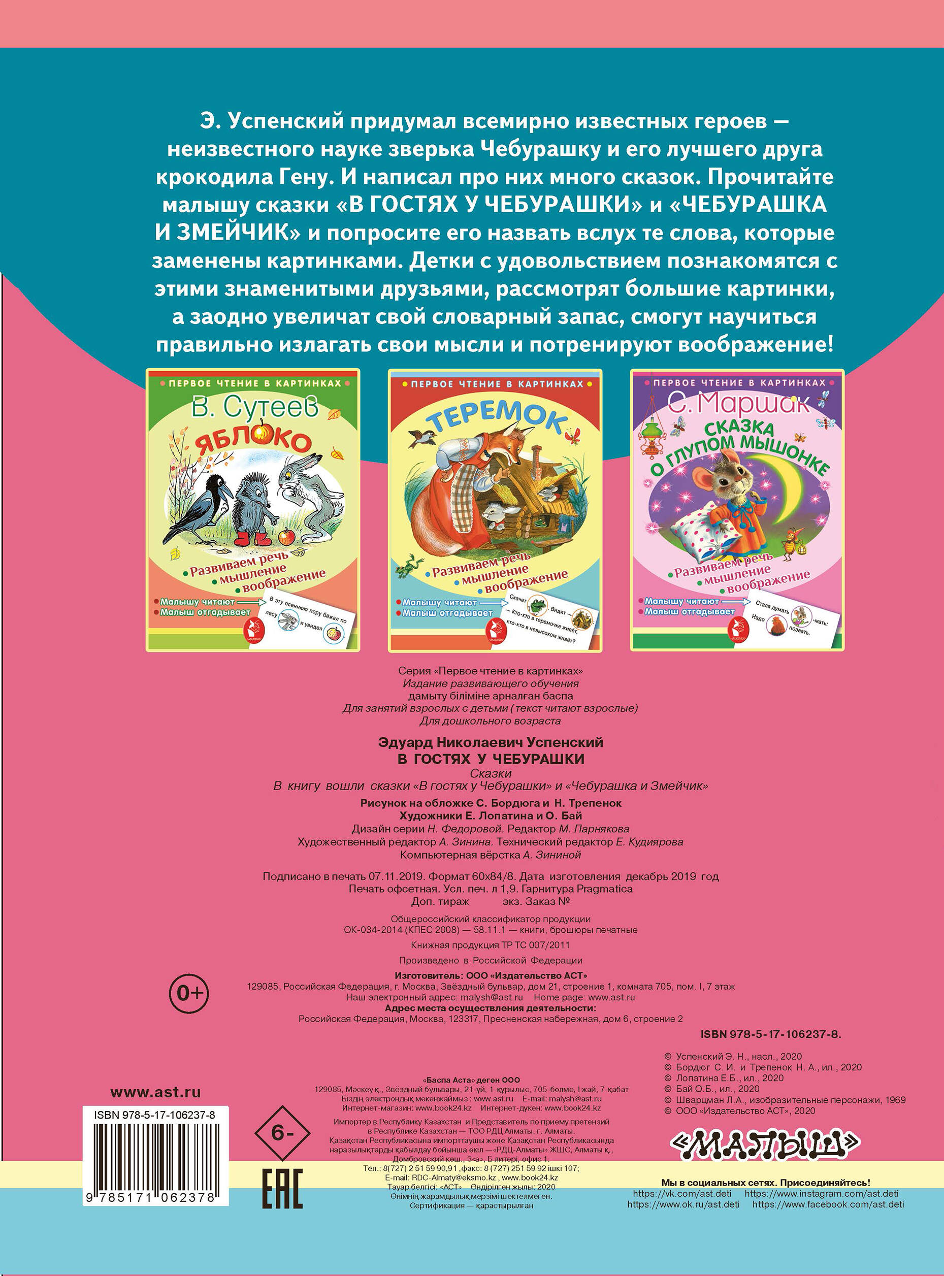 Прочитайте малышу сказки "В гостях у Чебурашки" и "Чебурашка и Змейчик" и попросите его назвать вслух те слова, которые заменены картинками.
