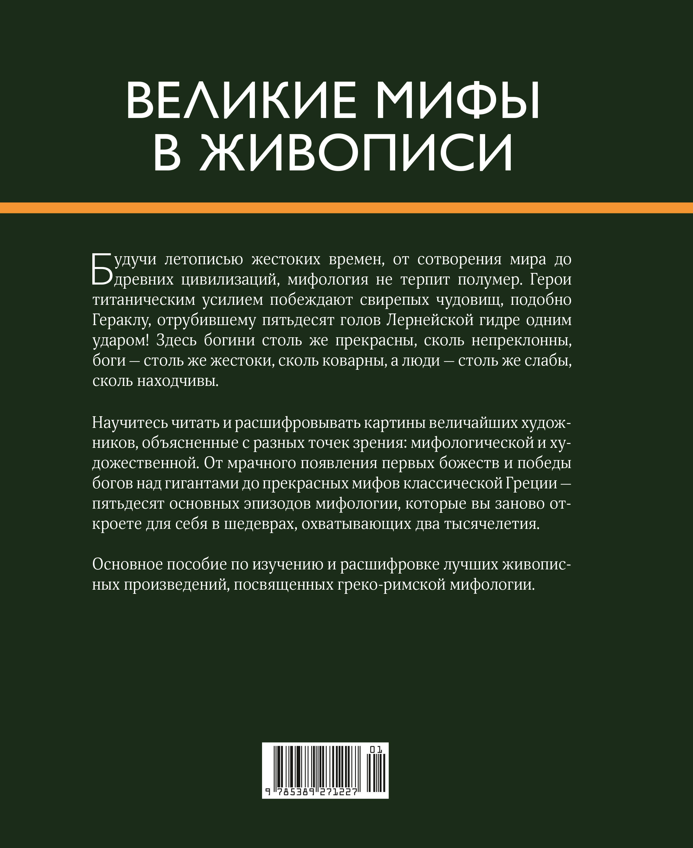 В мифологии все страсти напряжены до предела: герои титаническими усилиями побеждают страшных монстров, прекрасные богини непреклонны, боги жестоки и коварны, а люди слабы, но изобретательны. Вся мифологическая история Древней Греции отражена на страницах этой книги, и предана через видение художников разных эпох, что дает старым мифам новые повороты и прочтения. Внимательно изучив "Великие мифы в живописи", можно легко разобраться в греко-римской мифологии, научится читать и расшифровывать картины величайших художников. Автор подробно рассматривает пятьдесят сюжетов: от появления первых божеств до мифа о Сапфо, и иллюстрирует их произведениями искусства, охватывающими почти два тысячелетия!