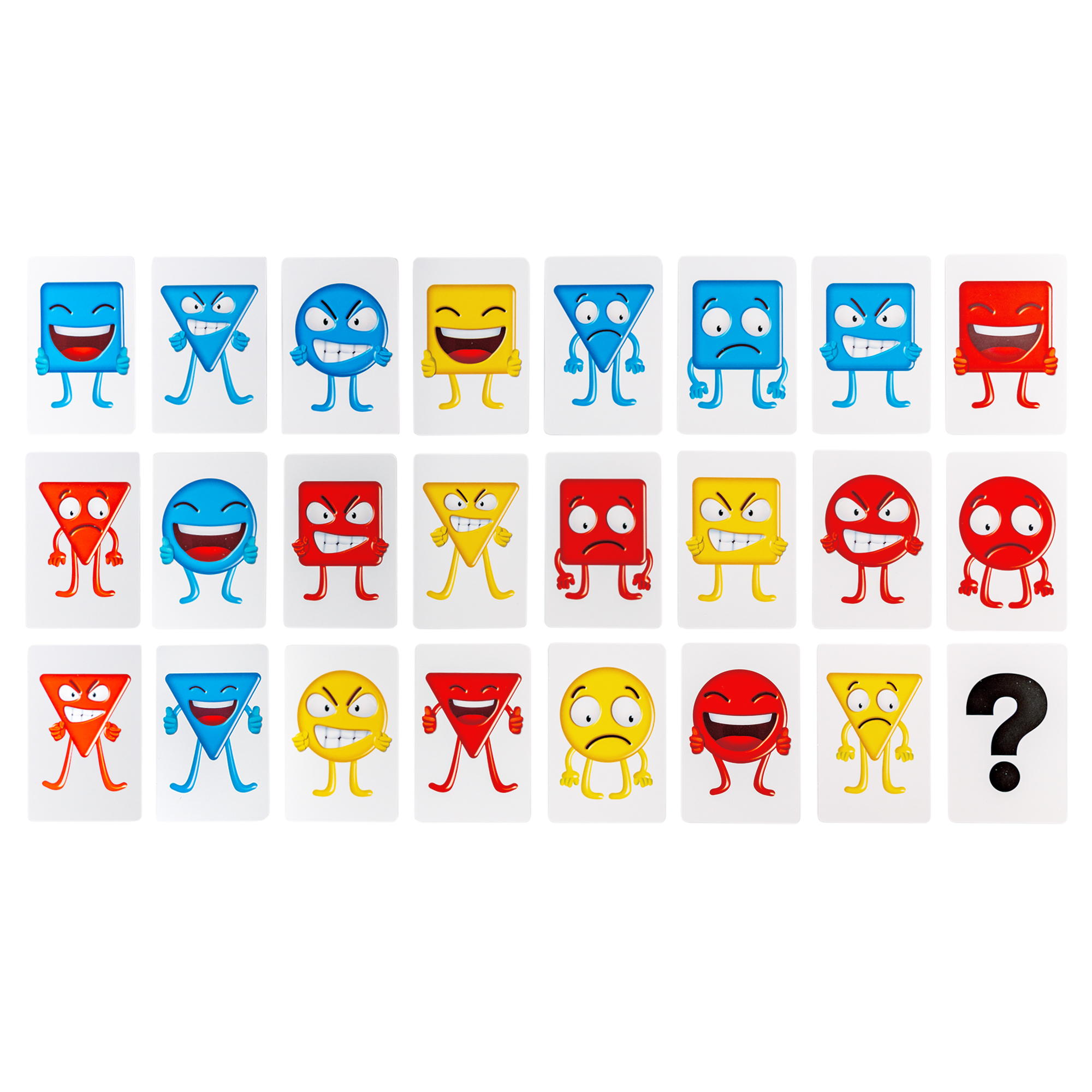 Три кубика – ЦВЕТ, ФОРМА и ЭМОЦИЯ – сообщают игрокам свойства Человечков. Карта-выручалка помогает игрокам ответить первыми, если они определили Человечка по свойству, подсказанному кубиками.