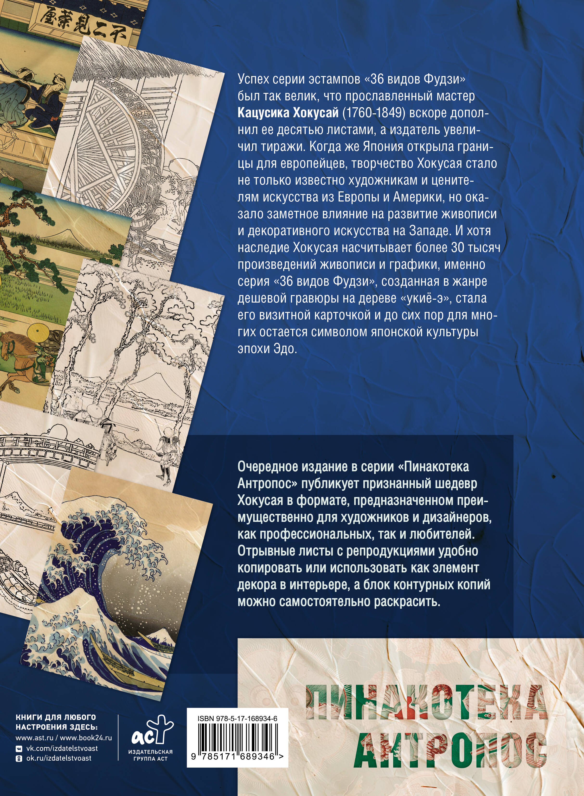 Очередное издание в серии «Пинакотека Антропос» публикует шедевр Хокусая в формате, предназначенном для художников и дизайнеров, профессионалов и любителей. Отрывные листы с репродукциями удобно копировать и использовать как элемент декора в интерьере, а блок контурных копий можно самостоятельно раскрасить.