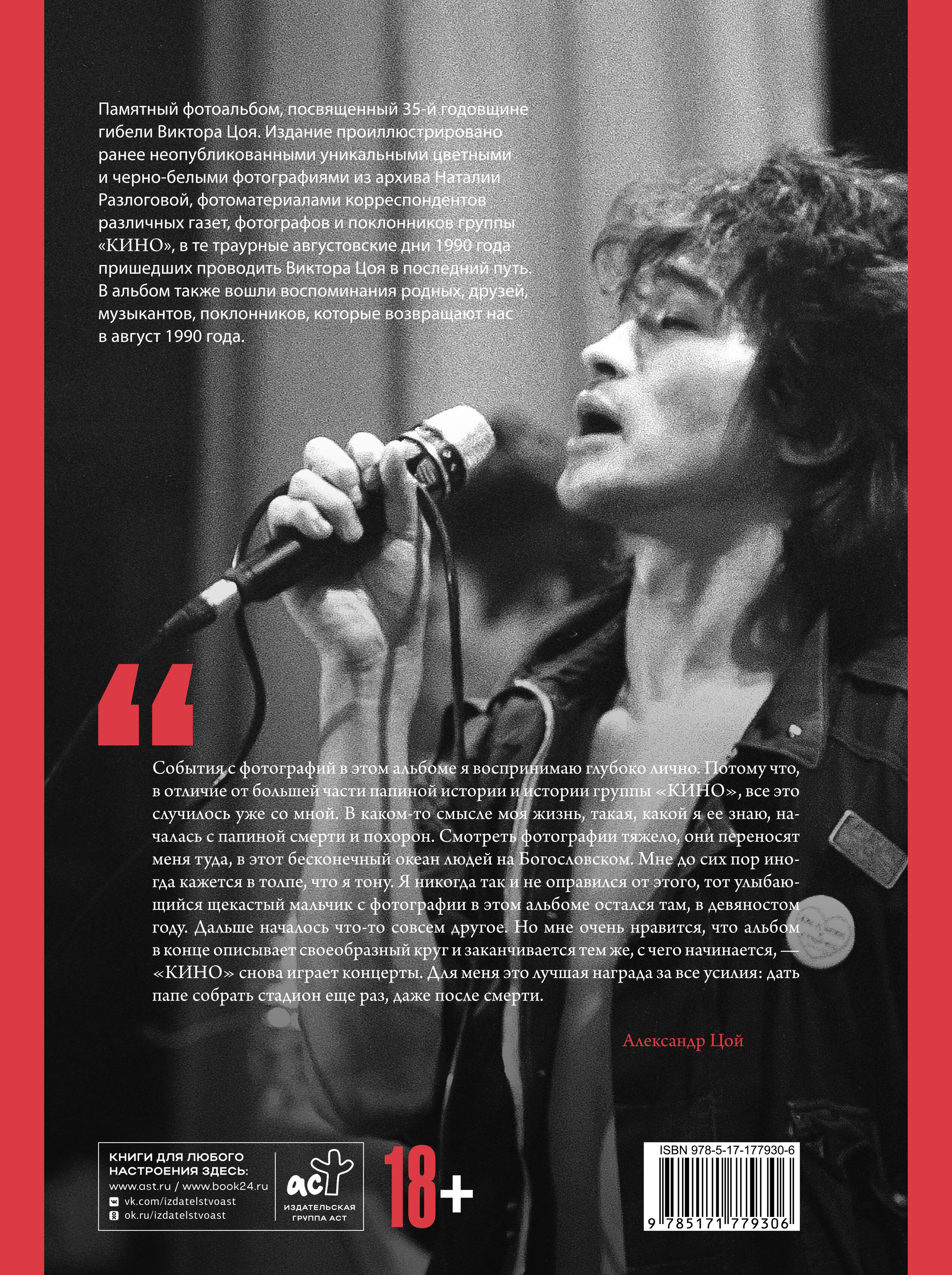 Памятный фотоальбом, посвященный 35-й годовщине гибели Виктора Цоя. Издание проиллюстрировано ранее неопубликованными уникальными цветными и черно-белыми фотографиями из архива Наталии Разлоговой, а также фотоматериалами корреспондентов различных газет, фотографов и просто поклонников группы "КИНО" в те траурные августовские дни 1990 года, пришедших проводить Виктора Цоя в последний путь. Воспоминания родных, друзей, музыкантов, поклонников возвращают нас в август 1990 года.