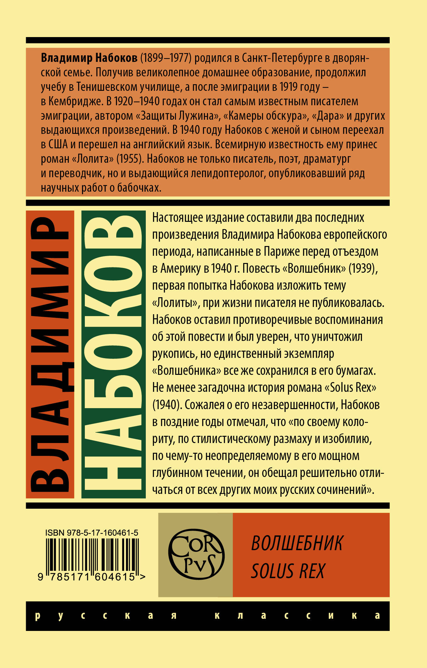 В этом уникальном сборнике представлены два малоизвестных произведения Владимира Набокова, завершающих его европейский цикл сочинений. Повесть “Волшебник”, написанная в 1939 году в Париже, — предшественник знаменитой “Лолиты” и первая попытка писателя исследовать темы скандального романа. Безымянный мужчина средних лет влюбляется в двенадцатилетнюю девочку. Чтобы стать ее опекуном, он женится на ее больной матери-вдове, однако судьба у Набокова часто способна разрушить и самые детально продуманные планы. У “Волшебника” поистине загадочная история — издатели не опубликовали его при жизни автора, а сам Набоков думал, что уничтожил все версии повести. Однако по счастливой случайности последняя версия “Волшебника” был обнаружена в его бумагах, и лишь в 1986 году сын писателя, Дмитрий Набоков, перевел ее на английский язык, и в том же году повесть наконец увидела свет.