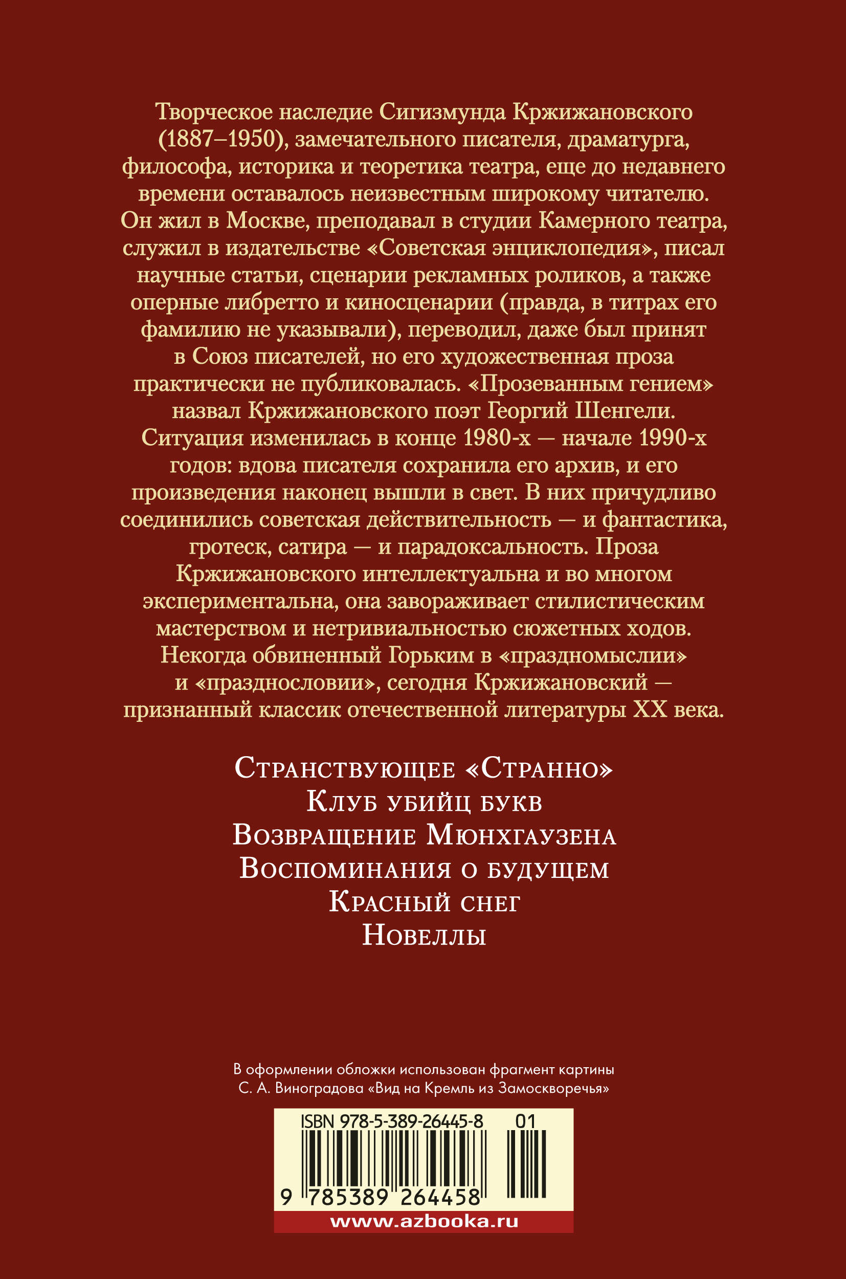 Творческое наследие Сигизмунда Кржижановского (1887–1950), замечательного писателя, драматурга, философа, историка и теоретика театра, еще до недавнего времени оставалось неизвестным широкому читателю. Он жил в Москве, преподавал в студии Камерного театра, служил в издательстве "Советская энциклопедия", писал научные статьи, сценарии рекламных роликов, а также оперные либретто и киносценарии (правда, в титрах его фамилию не указывали), переводил, даже был принят в Союз писателей, но его художественная проза практически не публиковалась. "Прозеванным гением" назвал Кржижановского поэт Георгий Шенгели.