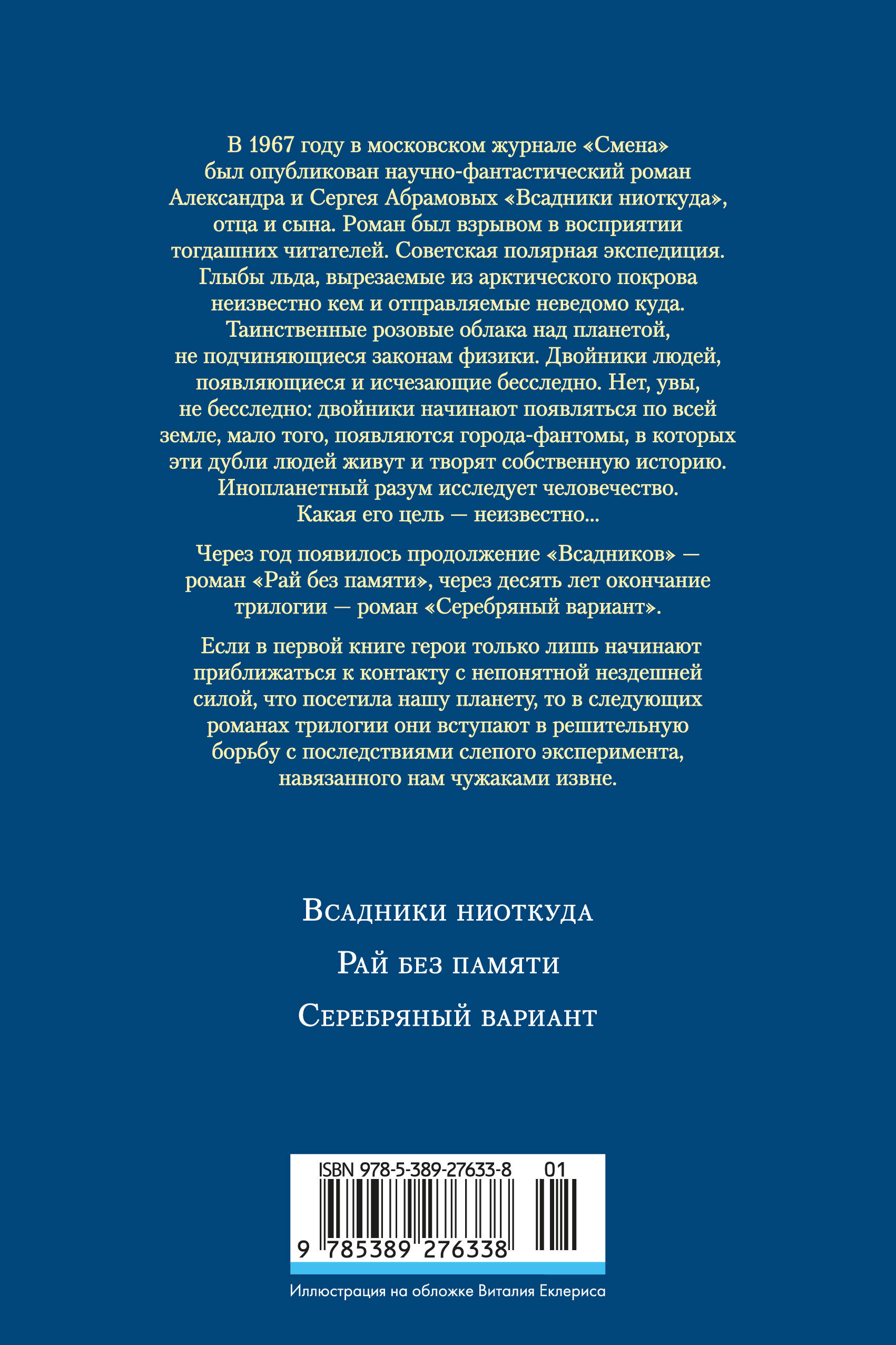 В 1967 году в московском журнале «Смена» был опубликован научно-фантастический роман Александра и Сергея Абрамовых «Всадники ниоткуда», отца и сына. Роман был взрывом в восприятии тогдашних читателей. Советская полярная экспедиция. Глыбы льда, вырезаемые из арктического покрова неизвестно кем и отправляемые неведомо куда. Таинственные розовые облака над планетой, не подчиняющиеся законам физики. Двойники людей, появляющиеся и исчезающие бесследно. Нет, увы, не бесследно: двойники начинают появляться по всей земле, мало того, появляются города-фантомы, в которых эти дубли людей живут и творят собственную историю. Инопланетный разум исследует человечество. Какая его цель — неизвестно…