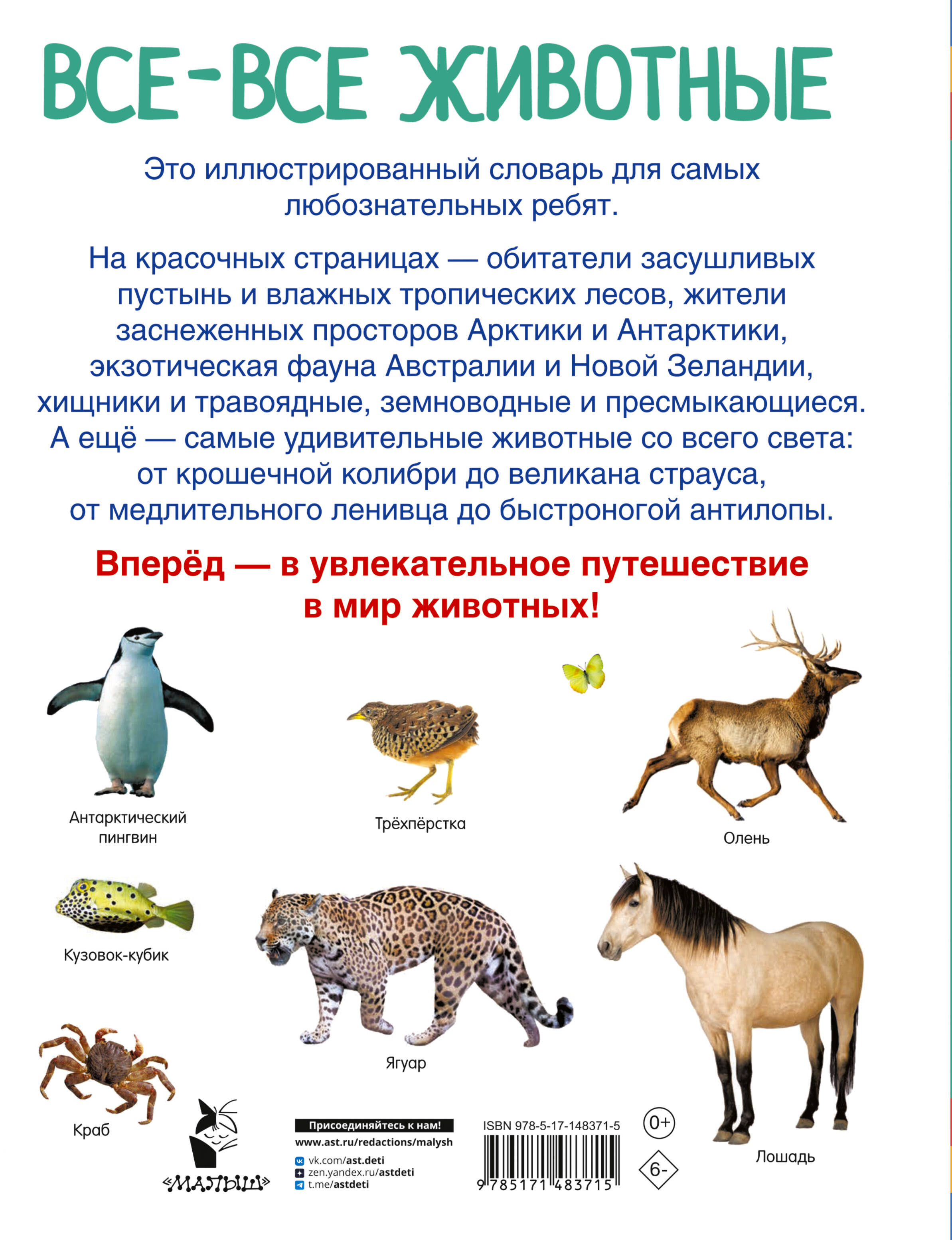"Все-все животные" — это красочно иллюстрированный словарь для детей. На его страницах малышей ждёт встреча с животными со всего света: обитателями тропиков, океанов и рек, представителями фауны тайги и тундры, существами ползающими, прыгающими, плавающими и летающими. Книга поможет ребёнку сделать первые шаги в изучении фауны нашей планеты, узнать названия животных, расширить кругозор.