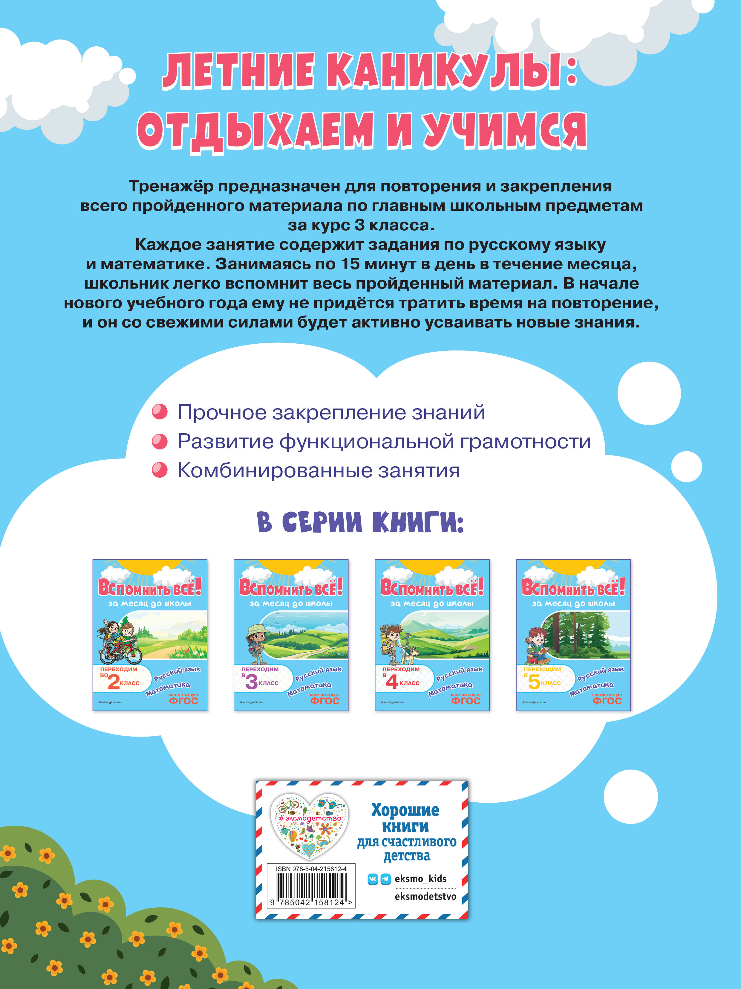 Тренажёр для учеников начальной школы предназначен для повторения и закрепления всего пройденного материала за курс 3 класса. Пособие состоит из 30 комбинированных занятий, каждое из которых включает в себя два задания по русскому языку и два задания по математике. Выполняя в день по одному занятию в течение 10—15 минут, школьник в течение месяца вспомнит и отработает все пройденные темы по важнейшим школьным предметам. Прикладной характер заданий будет поддерживать интерес ребёнка к их выполнению.