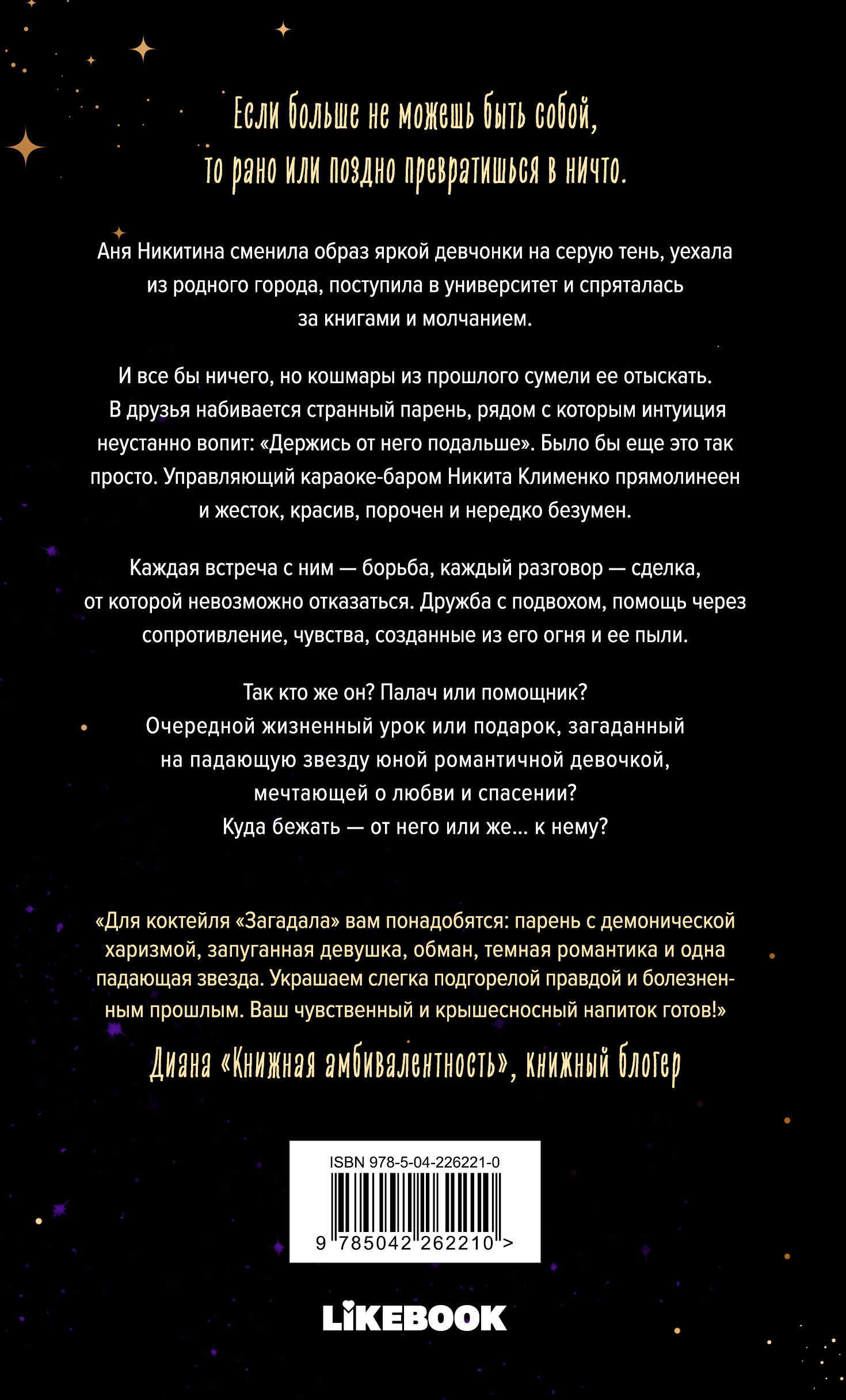 Аня Никитина сменила образ яркой девчонки на серую тень, уехала из родного города, поступила в университет и спряталась за книгами и молчанием. И все бы ничего, но кошмары из прошлого сумели ее отыскать. В друзья набивается странный парень, рядом с которым интуиция неустанно вопит: "Держись от него подальше". Было бы еще это так просто. Управляющий караоке-бара Никита Клименко прямолинеен и жесток, красив, порочен и нередко безумен. Каждая встреча с ним — борьба, каждый разговор — сделка, от которой невозможно отказаться. Дружба с подвохом, помощь через сопротивление, чувства, созданные из его огня и ее пыли.