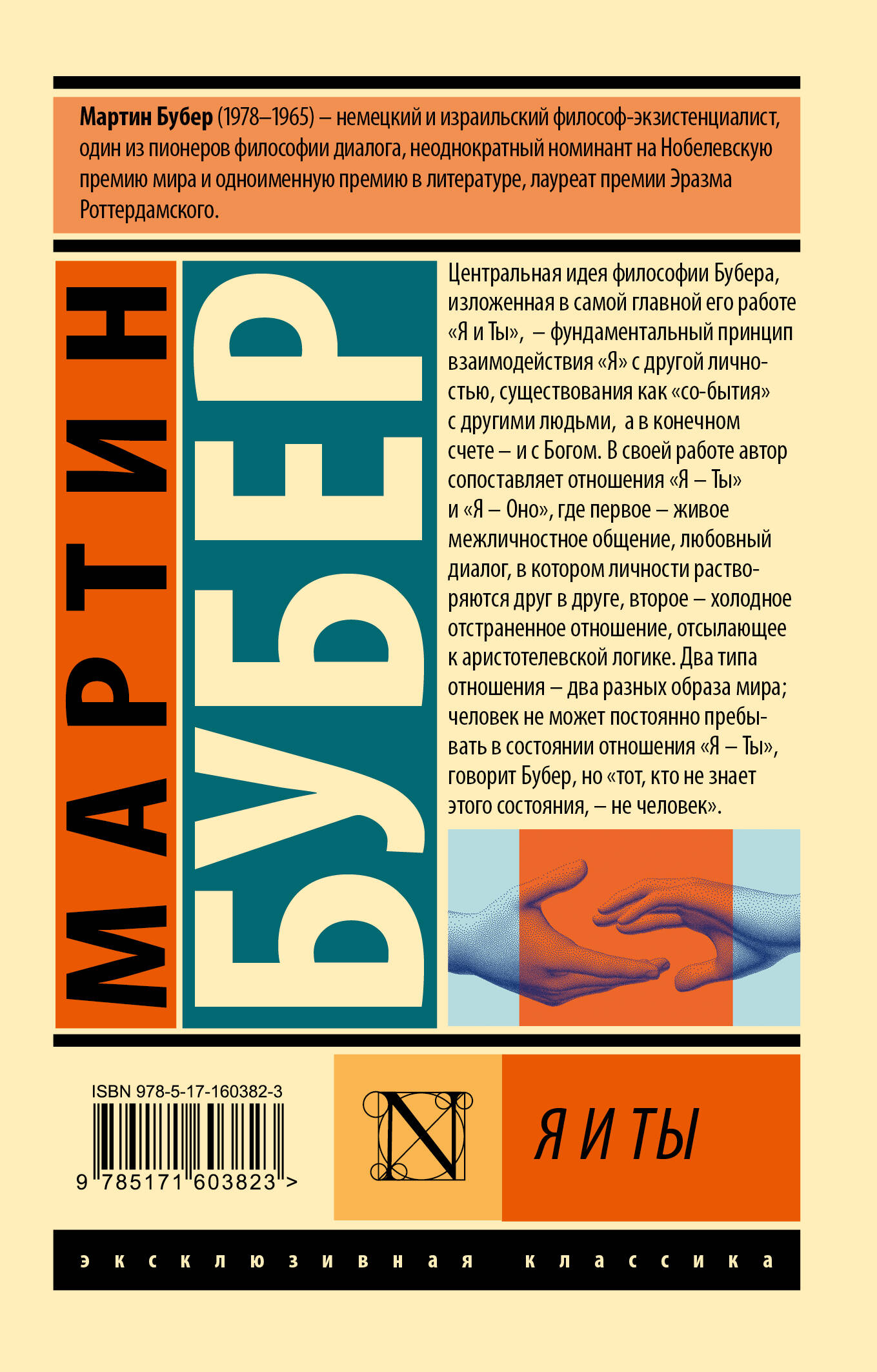Центральная идея философии Бубера, изложенная в самой главной его работе «Я и Ты», – фундаментальный принцип взаимодействия «Я» с другой личностью, существования как «со-бытия» с другими людьми, а в конечном счете – и с Богом. В своей работе автор сопоставляет отношения «Я – Ты» и «Я – Оно», где первое – живое межличностное общение, любовный диалог, в котором личности растворяются друг в друге, второе – холодное отстраненное отношение, отсылающее к аристотелевской логике. Два типа отношения – два разных образа мира; человек не может постоянно пребывать в состоянии отношения «Я – Ты», говорит Бубер, но «тот, кто не знает этого состояния, – не человек».