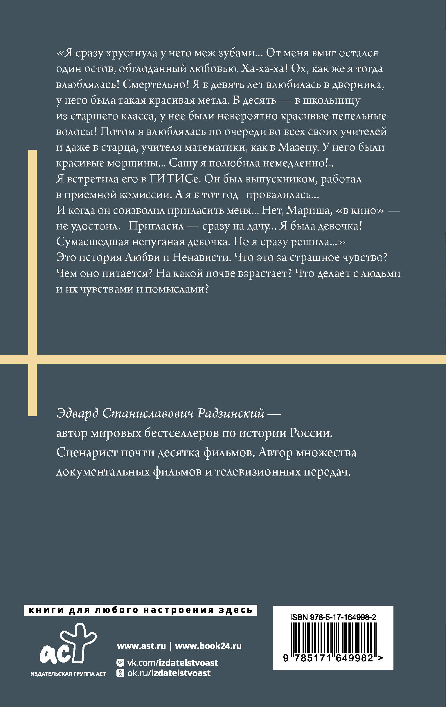 Я сразу хрустнула у него меж зубами... От меня вмиг остался один остов, обглоданный любовью. Ха-ха-ха! Ох, как же я тогда влюблялась! Смертельно! Я в девять лет влюбилась в дворника, у него была такая красивая метла. В десять - в школьницу из старшего класса, у нее были невероятно красивые пепельные волосы! Потом я влюблялась по очереди во всех своих учителей и даже в старца, учителя математики, как в Мазепу. У него были красивые морщины …Сашу я полюбила немедленно!.... Я встретила его в ГИТИСе. Он был выпускником, работал в приемной комиссии. А я в тот год провалилась... И когда он соизволил пригласить меня...Нет, Мариша ,"в кино" — не удостоил. Пригласил — сразу на дачу... Я была девочка! Сумасшедшая непуганая девочка. Но я сразу решила….