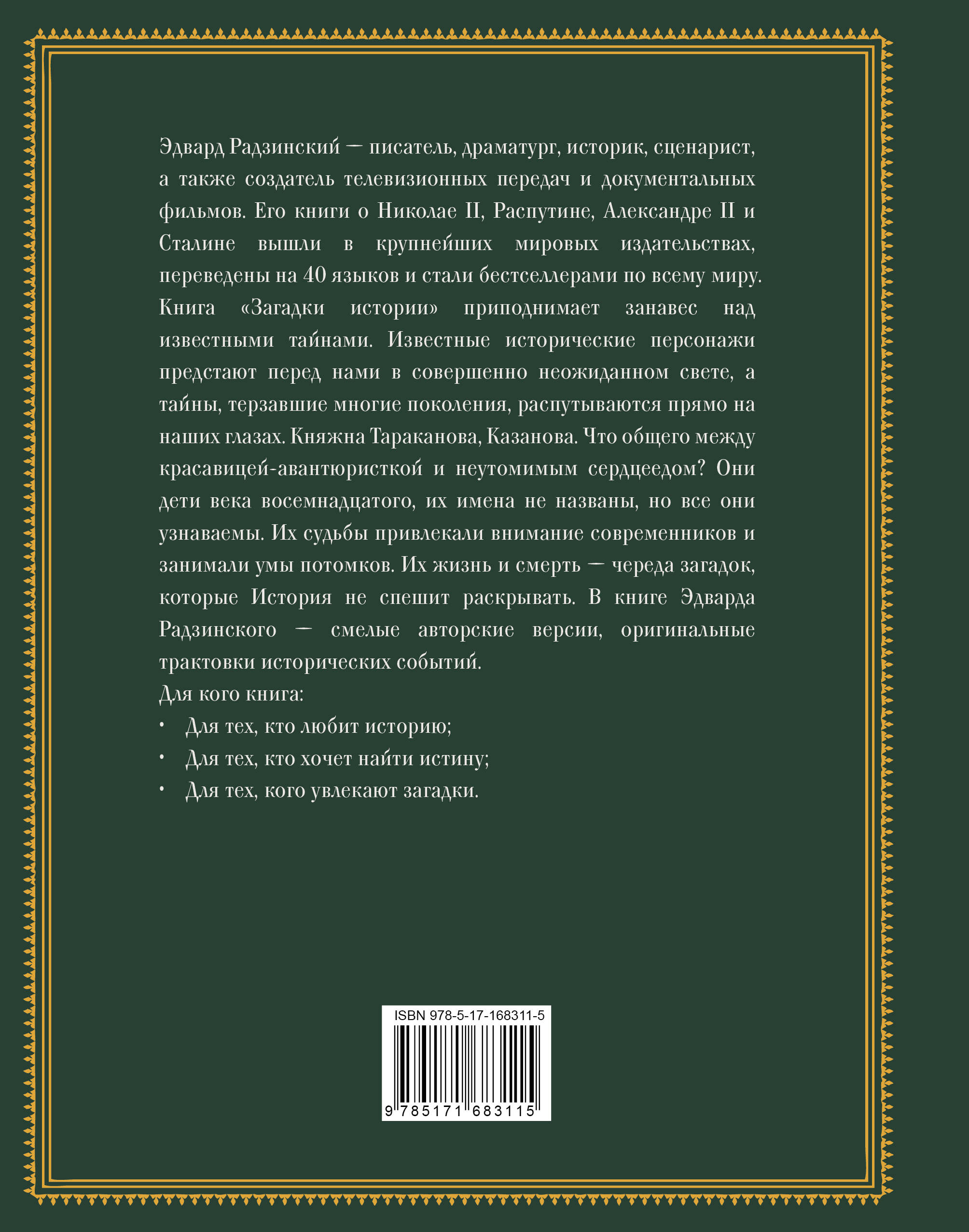 Книга "Загадки истории" приподнимает занавес над известными тайнами. Известные исторические персонажи предстают перед нами в совершенно неожиданном свете, а тайны, терзавшие многие поколения, распутываются прямо на наших глазах. Княжна Тараканова, Казанова. Что общего между красавицей-авантюристкой и неутомимым сердцеедом? Они дети века восемнадцатого, их имена не названы, но все они узнаваемы. Их судьбы привлекали внимание современников и занимали умы потомков. Их жизнь и смерть — череда загадок, которые История не спешит раскрывать. В книге Эдварда Радзинского — смелые авторские версии, оригинальные трактовки исторических событий.