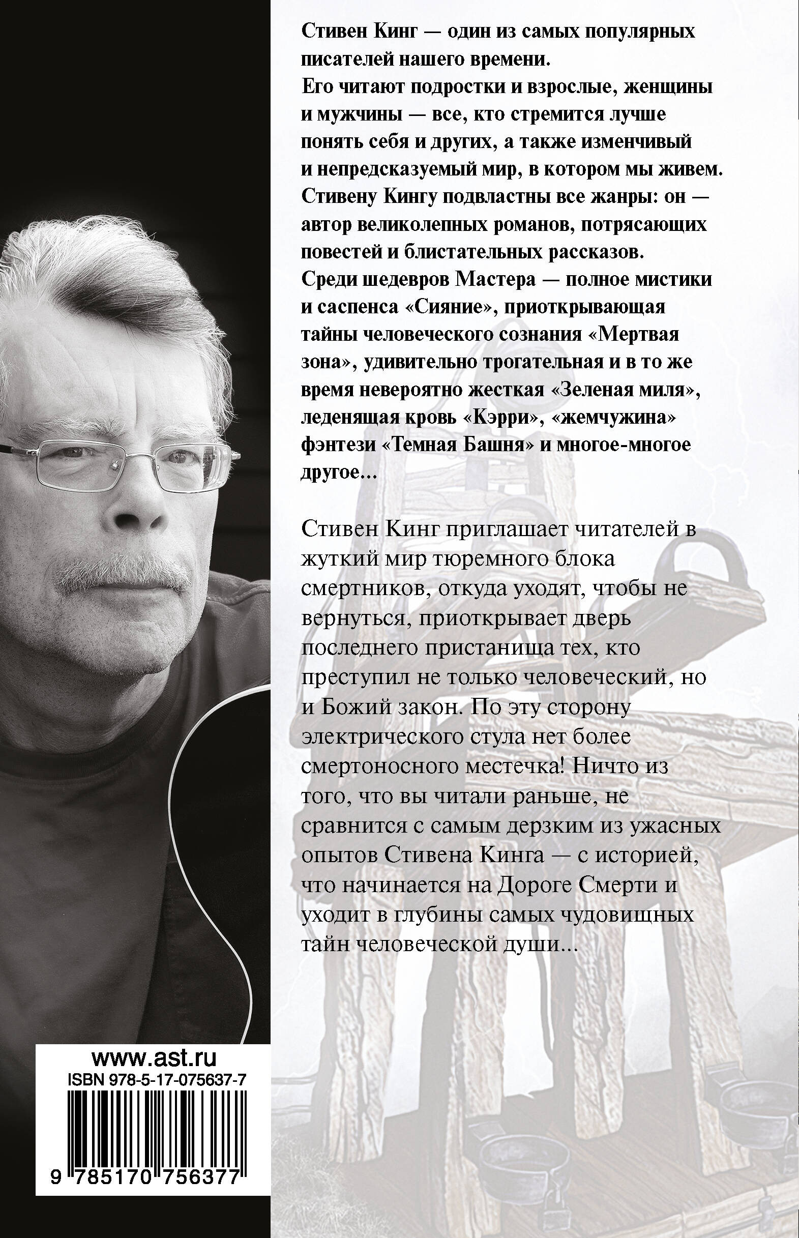 Стивен Кинг приглашает читателей в жуткий мир тюремного блока смертников, откуда уходят, чтобы не вернуться, приоткрывает дверь последнего пристанища тех, кто преступил не только человеческий, но и Божий закон. По эту сторону электрического стула нет более смертоносного местечка! Ничто из того, что вы читали раньше, не сравнится с самым дерзким из ужасных опытов Стивена Кинга - с историей, что начинается на Дороге Смерти и уходит в глубины самых чудовищных тайн человеческой души...