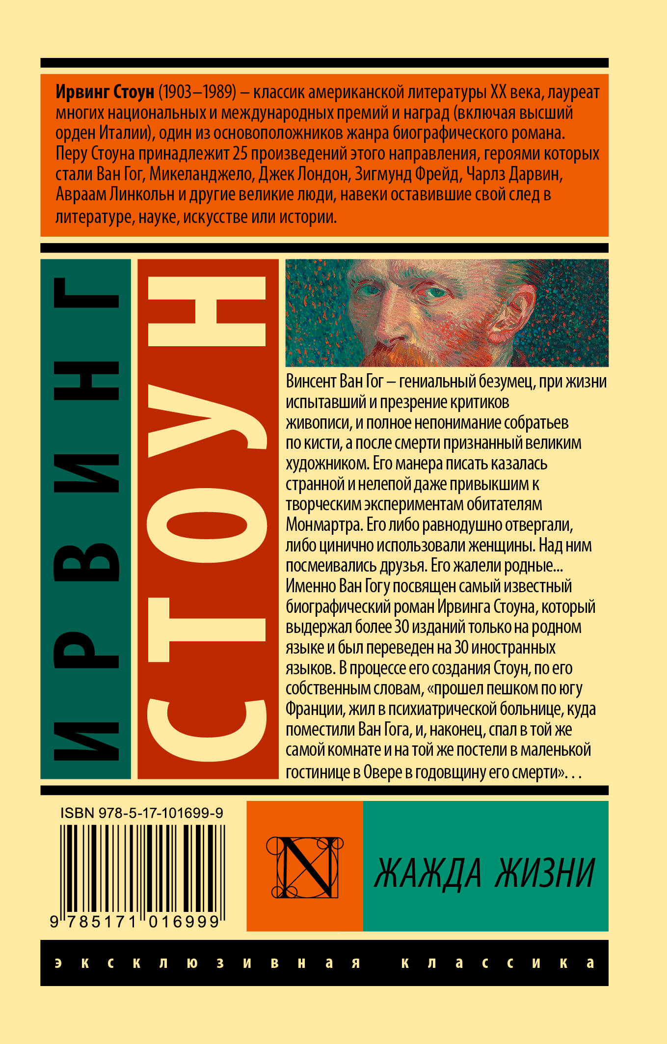 Именно Ван Гогу посвящен самый известный биографический роман Ирвинга Стоуна, который выдержал более 30 изданий только на родном языке и был переведен на 30 иностранных языков. В процессе его создания Стоун, по его собственным словам, "прошел пешком по югу Франции, жил в психиатрической больнице, куда поместили Ван Гога, и, наконец, спал в той же самой комнате и на той же постели в маленькой гостинице в Овере в годовщину его смерти"…