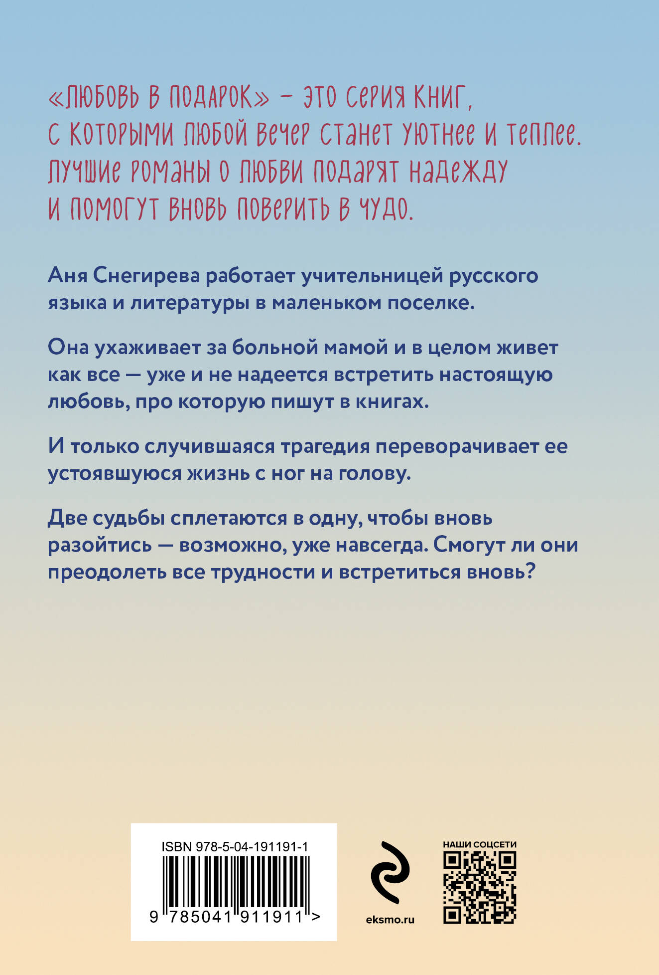 Аня Снегирева работает учительницей русского языка и литературы в маленьком поселке. Она ухаживает за больной мамой и в целом живет как все — уже и не надеется встретить настоящую любовь, про которую пишут в книгах. И только случившаяся трагедия переворачивает ее устоявшуюся жизнь с ног на голову. Две судьбы сплетаются в одну, чтобы вновь разойтись — возможно, уже навсегда. Смогут ли они преодолеть все трудности и встретиться вновь?