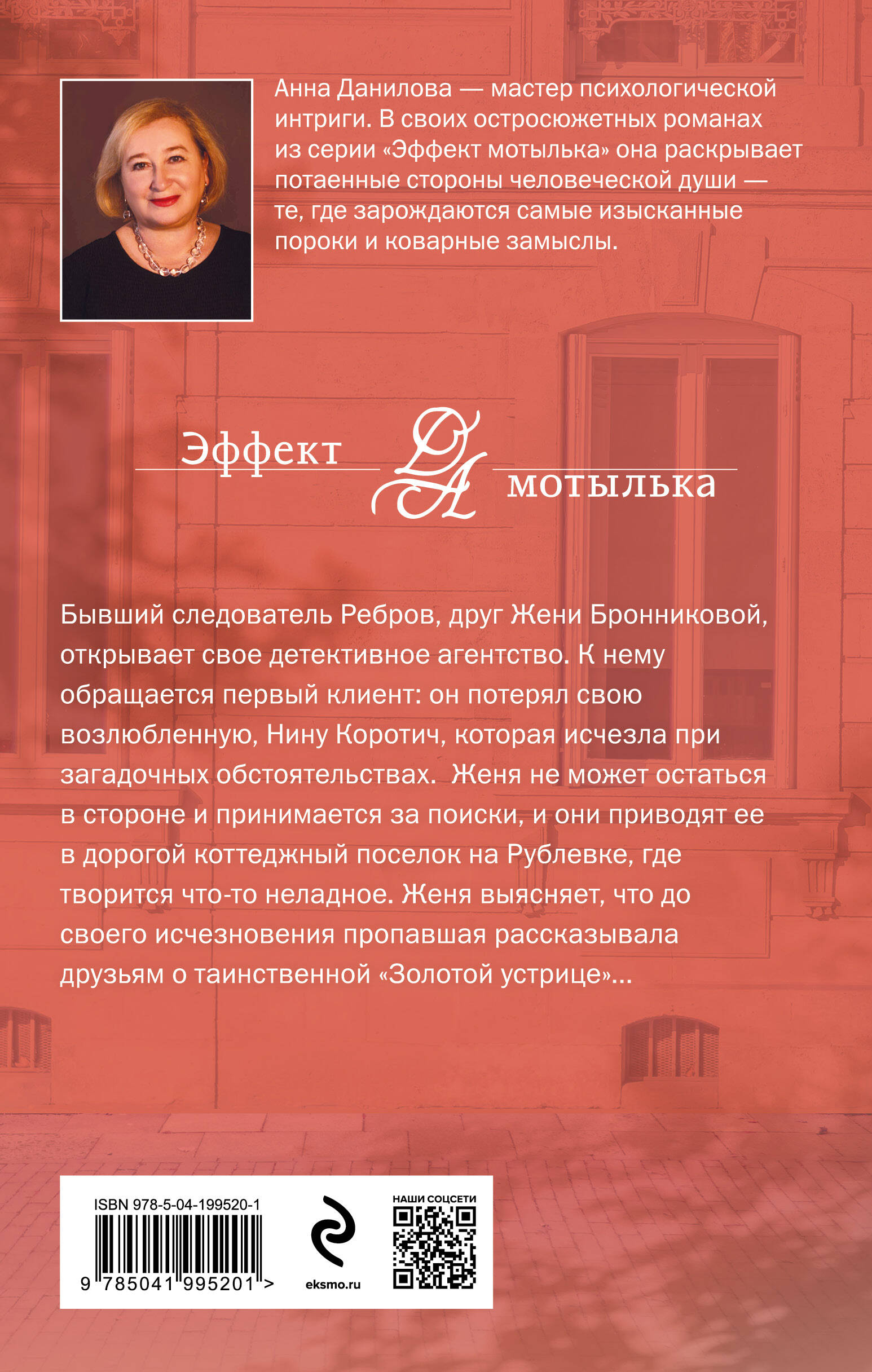 Бывший следователь Ребров, друг Жени Бронниковой, открывает свое детективное агентство. К нему обращается первый клиент: он потерял свою возлюбленную, Нину Коротич, которая исчезла при загадочных обстоятельствах. Женя не может остаться в стороне и принимается за поиски, и они приводят ее в дорогой коттеджный поселок на Рублевке, где творится что-то неладное. Женя выясняет, что до своего исчезновения пропавшая рассказывала друзьям о таинственной «Золотой устрице»...