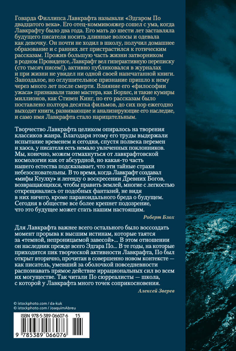 Говард Филлипс Лавкрафт, не опубликовавший при жизни ни одной книги, сделался маяком и ориентиром целого жанра, кумиром как широких читательских масс, так и рафинированных интеллектуалов, неиссякаемым источником вдохновения для кинематографистов, да и само его имя стало нарицательным. Сам Борхес восхищался его рассказами, в которых место человека — на далекой периферии вселенской схемы вещей, а силы надмирные вселяют в души неосторожных священный ужас. Итак, вашему вниманию предлагаются классические произведения одного из самых влиятельных мифотворцев двадцатого века, причем в эталонных переводах. Кроме рассказов и повестей, том включает монументальное исследование "Сверхъестественный ужас в литературе" и даже цикл сонетов.